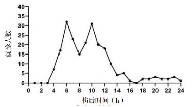 伤后24 h来本院就诊伤员分布见图 1。203例(92.69%)伤员在伤后4~15 h被送至本院,在伤后6 h和10 h形成两个就诊高峰,分别收治伤员32例和31例。