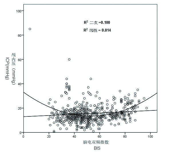 二次项曲线模型显示当BIS值在55左右时ICP值最低,且模型拟合度也显著高于线性模型(R2=0.1),这提示将TBI患者的BIS值控制在55左右对ICP的控制可能最为有利 图 1 BIS指数与ICP值的线性相关与曲线相关散点图 |