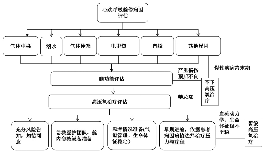 总之,复苏后脑功能不良的患者需全面评估患者情况、高压氧治疗受益及风险。把握高压氧治疗时机,做好入舱前患者、设备、医护人员全面准备,同时与家属做好充分风险告知后方可进行。对慢性疾病终末期心搏呼吸停止后的患者,以及脑功能评定结果预测严重预后不良的患者须慎用高压氧治疗,详细流程见图 1。