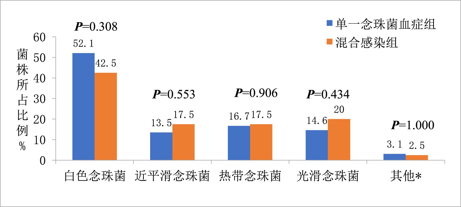 其他*为克柔念珠菌1例、季也蒙念珠菌1例、皱褶念珠菌1例、无名假丝酵母菌1例 图 1 混合性念珠菌血症组与单一念珠菌血症组的念珠菌种类分布图 Fig 1 Comparison of the distribution of Candida species isolated from mixed Candida/bacterial BSIs and candidaemia |