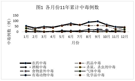 运用统计学折线图不仅能直观地得出农药中毒(6、8、9月集中)和药品中毒(6、7月常见)的例数比其他类中毒多,分析出不同急性中毒类型的例数;波动趋势情况:急性气体中毒在1、12月为多;有毒动物中毒以8、9月为多;剩余几项类型的中毒在各月份趋势不典型,见图 1。
