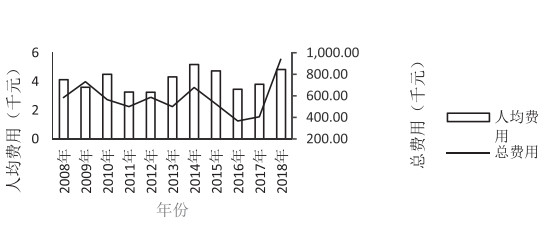 农药中毒、气体中毒化学品中毒等人均费用最高,而食物意外中毒人均费用较低。2008~2018年急性中毒患者总费用波动范围较大,尤其以2009~2010年(减少29.56%)和2017~2018年(增长57.22%)最为明显;历年人均费用(4 090.2±6 343.4)元,2014年最高为5 182元,2012年最低为3 258元。见图 2~3。