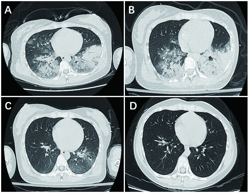 图 1 患者的胸部高分辨CT检查。A:入院当天;B:入院后1 d;C:入院后4 d;D:出院后14 d |