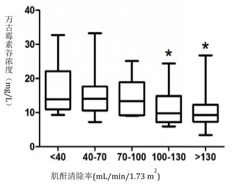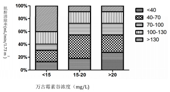图 3 不同万古霉素血药浓度组肌酐清除率分布情况 |