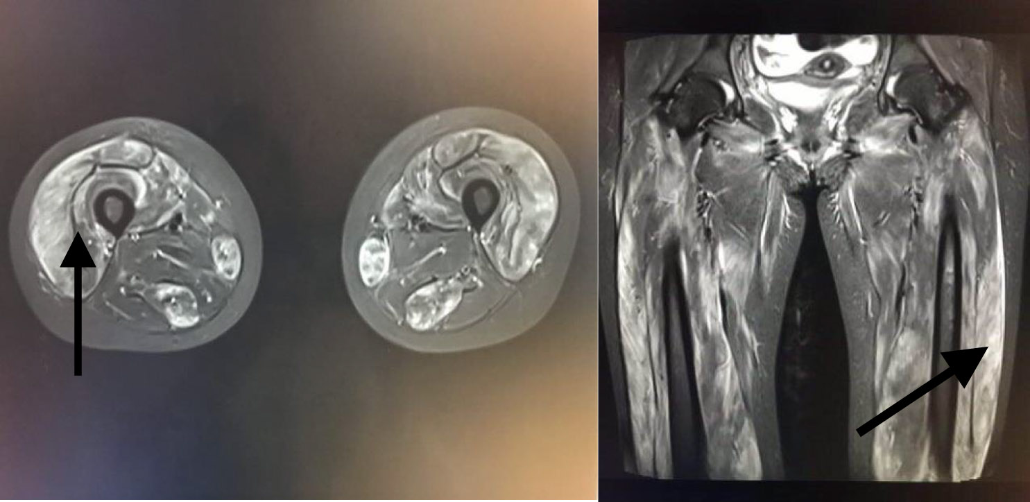 图 1 下肢MRI(箭头所指为肌肉水肿表现) |