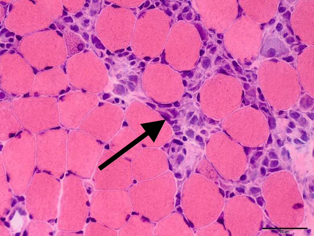 图 2 左肱二头肌肌肉活检HE染色(箭头所指为肌纤维坏死) |
