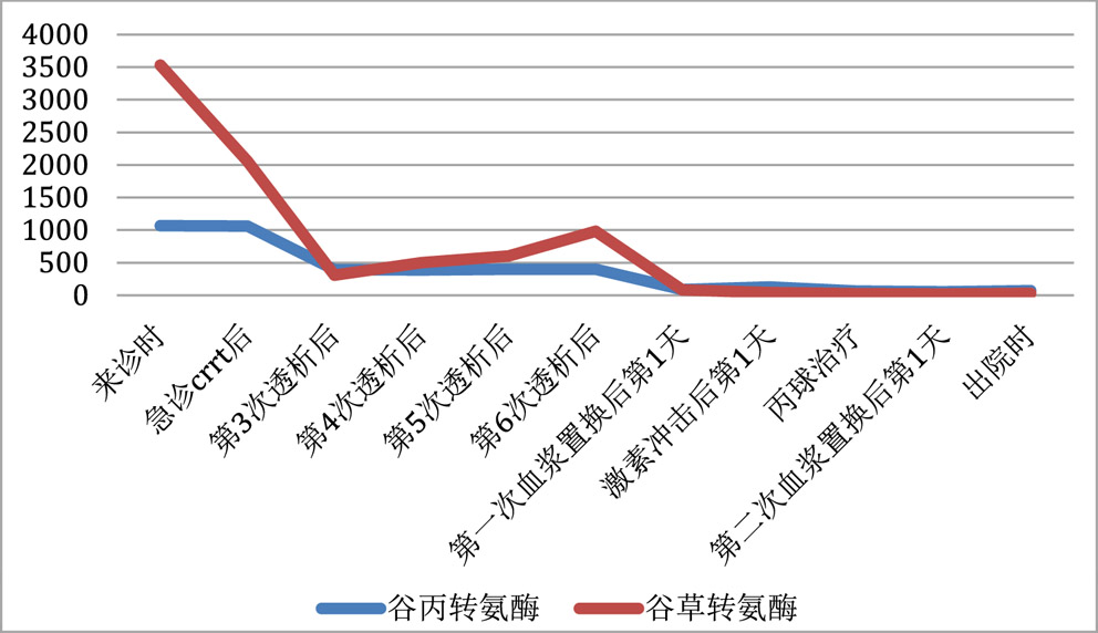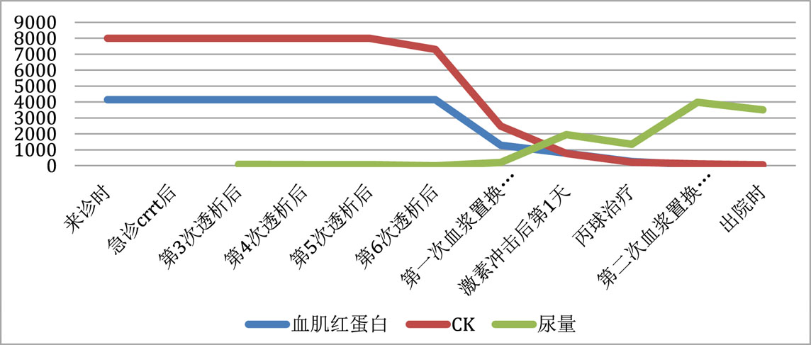 患者,女,20岁,主因“四肢无力9 d,无尿7 d”入院。9 d前无明显诱因出现乏力肌痛,伴随酱油色尿、少尿,当地医院查CK、尿肌红蛋白明显升高,予水化、碱化及透析治疗CK未见明显下降转诊。既往体健,否认用药史。查体:T37.8℃,P120次/min,RR18次/min, Bp147/68 mmHg(1mmHg=0.133Kpa), 双侧大腿可见瘀斑,轻度水肿,有压痛,近端肌力4级。双肺呼吸音低,未及啰音,心律齐,腹软,无压痛。辅助检查:血生化ALT1 065 IU/L,AST3 530 IU/L Scr332.7 μmol/L, eGFR16.375 mL/(min·1.73m2), BUN15.27 μmol/L, CK>8 000 U/L,肌红蛋白>4 140 ng/mL。尿常规:蛋白质+++,红细胞150~180 /HP,WBC100~120/HP。直接抗人球蛋白实验阴性。肌炎抗体阴性。血尿免疫固定电泳未见单克隆免疫球蛋白区带。感染方面筛查:肝炎抗体、CMV/EBV-DNA、呼吸道九种病毒、布氏杆菌、莱姆病、流行性出血热抗体、军团菌皆阴性;高通量病原体检测未检出原核微生物、病毒、真核微生物。重金属筛查阴性。糖化蛋白、甲状腺功能正常。肾脏超声:双肾体积增大且实质回声增强,结构欠清晰。大腿肌肉核磁:双大腿肌肉及双侧下肢肌带肌弥漫水肿,左侧股外侧肌肌筋膜水肿(图 1)。入院诊断横纹肌溶解合并急性肾损伤。治疗上,最初间断多次行高通量血液透治疗,血肌酐下降但尿量无明显恢复,且CK水平高居不下。进一步完善的肌肉活检结果(左肱二头肌肌肉)提示:肌纤维坏死、再生,伴随肌束血管周围少量炎细胞浸润,许多肌间毛细血管NSE深染,符合坏死性肌病样病理改变特点(图 2)。根据肌肉活检结果考虑免疫介导性坏死性肌病,行激素治疗(甲泼尼龙40 mg/d静点连续10 d后调整为口服泼尼松50 mg口服, 静脉激素治疗第3天时曾行甲泼尼龙500 mg静脉冲击1次)及2次血浆置换(每次分别置换3 000 mL)后CK明显下降,尿量也逐渐增多(图 3~4)。出院时患者口服强的松45 mg/d,尿量恢复至3 500 mL/d,生化结果:ALT67 U/L,AST26 U/L,Scr99.4 μmol/L, CK78U/L, 肌红蛋白23.5 ng/mL,尿肌红蛋白4.6 ng/mL。患者出院1个月后门诊复诊,血肌酐和ck正常,尿量正常,转归良好。