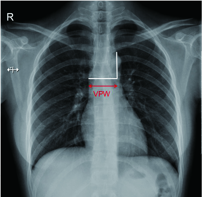 图 1 血管蒂宽度(VPW)的测量方法(首先从左锁骨下动脉外缘起点开始向下画一条垂直线,然后确认上腔静脉与右主支气管的重叠点,该重叠点到垂直线的水平距离即为VPW)