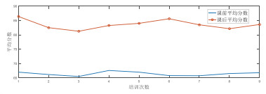 4.2 培训效果中长期预测对学员培训成绩数列构建灰度预测模型,本研究利用MATLAB对模型进行分析,预测未来第10及11次学员的培训成绩,并将分析结果进行可视化,如图 4~5所示,第1期至第9期,学员平均分数与灰度模型的预测值接近,这也验证了模型对学员培训成绩运动较高的拟合程度。灰色预测模型在培训分数历史数据基础上预测了第10及11期学员课前测试平均分66及67分;第10及11期培训学员课后测试平均分83及83.5分。