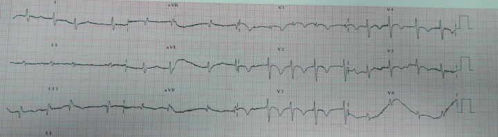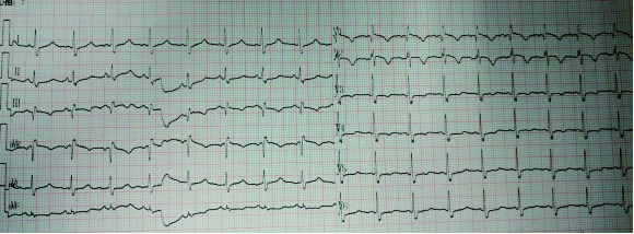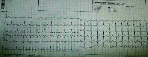 图 5 入院时心电图变化,窦性心动过速,SⅠQⅢTⅢ |