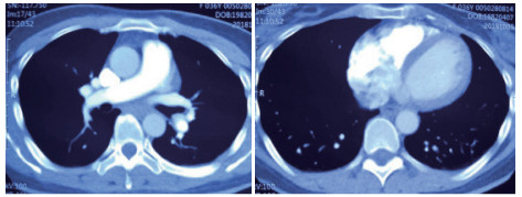 图 9 入院时CTPA提示右肺动脉主干充盈缺损、左肺亚段水平充盈缺损、右心室增长 |