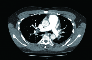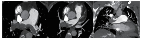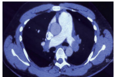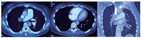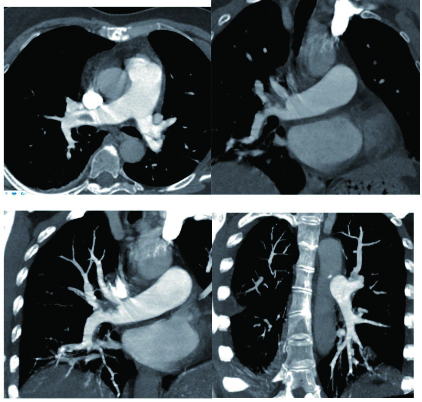 图 4 溶栓后的CTPA肺动脉主干血栓负荷明显减少、远段血液灌注明显增加 |