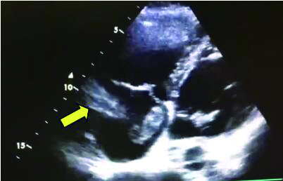 图 3 入院1周复查超声心动提示右心房漂浮血栓(黄色箭头) |