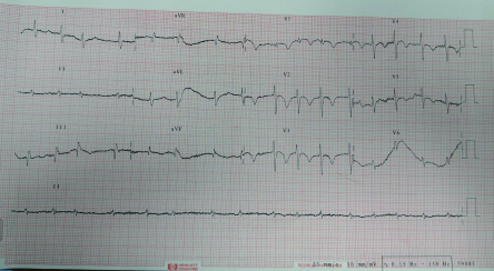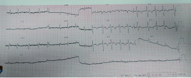 图 12 入院时心电图表现显示窦性心动过速、SⅠQⅢTIIII |