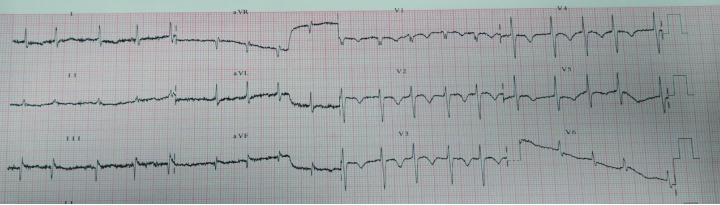 图 7 入院第4天病情变化时心电图变化。窦性心动过速,SⅠQⅢTⅢ,胸前导联T波加深 |