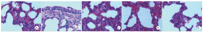 A:假手术组,B:感染性休克组,C:U50488H+感染性休克组,D:nor-BNI+U50488H+感染性休克组,E:nor-BNI+感染性休克组 图 1 各组光镜下肺组织病理学改变(HE×400) Fig 1 Histopathological features of lung(HE×400) |