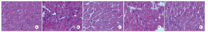 A:假手术组,B:感染性休克组,C:U50488H+感染性休克组,D:nor-BNI+U50488H+感染性休克组,E:nor-BNI+感染性休克组 图 2 各组光镜下心肌组织病理学改变(HE×400) Fig 2 Histopathological features of myocardium(HE×400) |