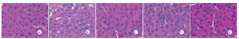 A:假手术组,B:感染性休克组,C:U50488H+感染性休克组,D:nor-BNI+U50488H+感染性休克组,E:nor-BNI+感染性休克组 图 3 各组光镜下肝组织病理学改变(HE×400) Fig 3 Histopathological features of liver(HE×400) |