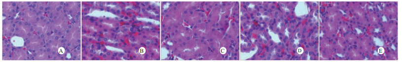 A:假手术组,B:感染性休克组,C:U50488H+感染性休克组,D:nor-BNI+U50488H+感染性休克组,E:nor-BNI+感染性休克组 图 4 U50488H对感染性休克肾组织形态的影响(HE×400) Fig 4 Histopathological features of kidney(HE×400) |