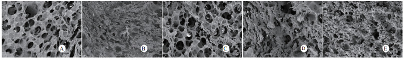 A:假手术组,B:感染性休克组,C:U50488H+感染性休克组,D:nor-BNI+U50488H+感染性休克组,E:nor-BNI+感染性休克组 图 5 肺组织扫描电镜观察(×200) Fig 5 Scanning electronic microscopic photos of lung(×200) |