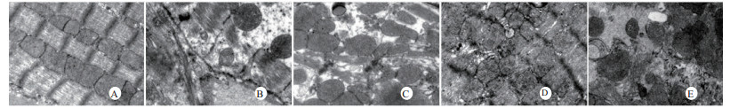 A:假手术组,B:感染性休克组,C:U50488H+感染性休克组,D:nor-BNI+U50488H+感染性休克组,E:nor-BNI+感染性休克组 图 6 心肌细胞透射电镜检查(×10 000) Fig 6 Transmission electronic microscopic photos of myocardial cell(×10 000) |