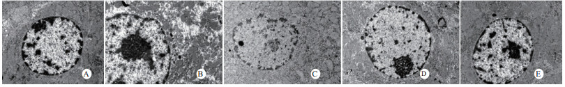 A:假手术组,B:感染性休克组,C:U50488H+感染性休克组,D:nor-BNI+U50488H+感染性休克组,E:nor-BNI+感染性休克组 图 7 肝细胞透射电镜检查(×10 000) Fig 7 Transmission electronic microscopic photos of liver(×10 000) |