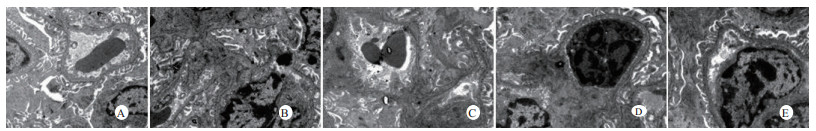 A:假手术组,B:感染性休克组,C:U50488H+感染性休克组,D:nor-BNI+U50488H+感染性休克组,E:nor-BNI+感染性休克组 图 8 肾组织透射电镜检查(×15 000) Fig 8 Transmission electronic microscopic photos of kidney(×15 000) |