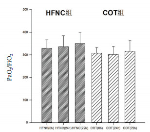 1.2 研究分组(1) HFNC组:拔管后开始使用经鼻导管湿化高流量吸氧装置(HFNC)进行吸氧治疗,HFNC型号(AIRVO2, Optiflow, Fisher & Paykel, Auckland, NewZealand);参数设置为吸入氧体积分数为50%,流量为60 L/min,根据患者氧饱和度调节参数,维持SPO2在93%以上, 持续治疗时间72 h,治疗时间超过72h后可转为普通吸氧治疗。