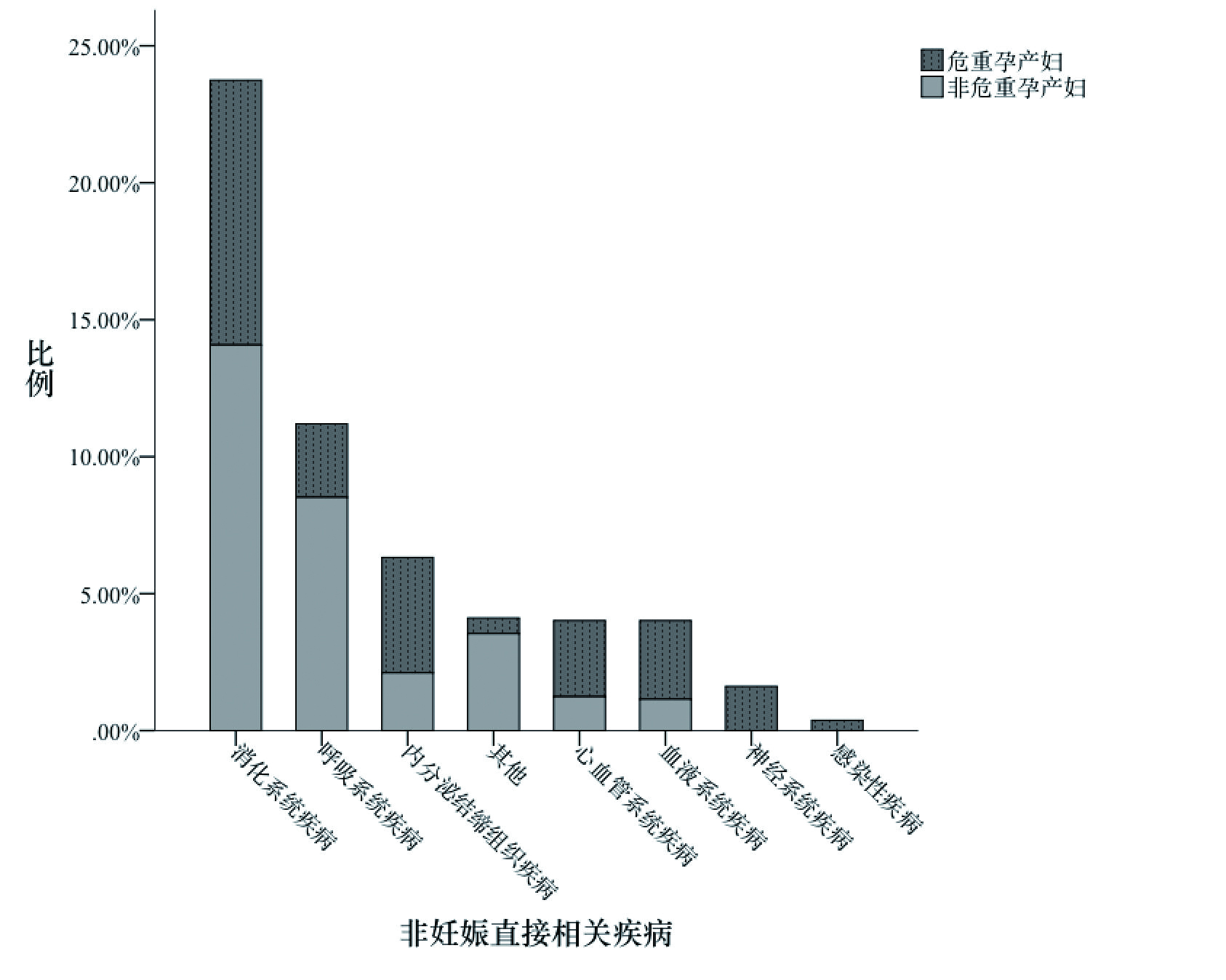 非妊娠直接相关病因导致留抢的孕产妇有579例,占55.46%。非妊娠直接相关疾病前三位分别为消化系统疾病(占23.75%)、呼吸系统疾病(占11.20%)、内分泌结缔组织疾病(占6.32%)。579例孕产妇中,危重孕产妇259例,非危重孕产妇320例。导致危重孕产妇留抢的前三位非妊娠直接相关疾病为消化系统疾病(占9.67%)、内分泌结缔组织疾病(占4.21%)和血液系统疾病(占2.87%)。导致非危重孕产妇留抢的前3位非妊娠直接相关疾病为消化系统疾病(占14.08%)、呼吸系统疾病(占8.52%)和其他疾病(包括泌尿系统疾病、性病以及外伤等)(占3.54%)详见表 3,图 1和2。