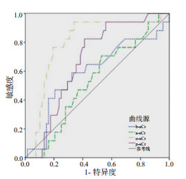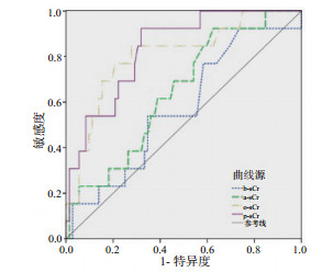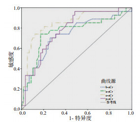 o-sCr和p-sCr均具有较好的预测AKI患者住院期间肾脏替代治疗的效能,AUC分别为0.806(95%CI:0.705~0.883)和0.833(95%CI:0.736~0.905),敏感度分别为0.846和0.923, 特异度分别为0.722和0.681。而b-sCr和a-sCr预测肾脏替代治疗的效能较差,AUC均 < 0.7,见图 1和表 4。