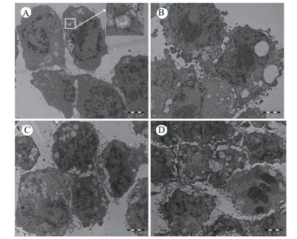 A:正常对照组; B: TNF-α 24 h组; C:TNF-α 48 h组; D:TNF-α 72 h组 图 1 大鼠AEC-Ⅱ超微结构及TNF-α刺激后变化(×10 000,醋酸枸橼酸银染色) Fig 1 Ultrastructure of rat AEC-Ⅱ and changes after TNF-α intervention (×10 000, silver citrate acetate staining) |