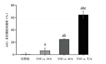 与对照组比较, aP < 0.05;与TNF-α 24 h比较, bP < 0.05;与TNF-α 48 h比较,cP < 0.05 图 2 AEC-Ⅱ增殖抑制率的变化 Fig 2 Changes of proliferation inhibition rate of AEC-Ⅱ cells |