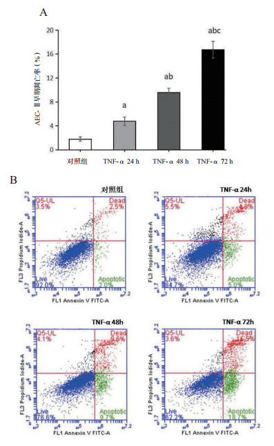 (A)与对照组比较, aP < 0.05;与TNF-α 24 h比较, bP < 0.05;与TNF-α 48 h比较,cP < 0.05;(B)十字线把图分为四个象限,左上象限代表坏死细胞比例,左下象限表示正常细胞比例,右上象限为晚期凋亡细胞比例,右下象限为早期凋亡细胞比例 图 3 AEC-Ⅱ早期凋亡率的变化 Fig 3 Changes of early apoptotic rate of AEC-Ⅱcells |