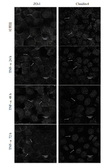 对照组ZO-1沿着细胞膜的内表面分布,镜下呈连续的线状带分布在细胞的边缘及细胞连接部位,在细胞间连接成网。TNF-α作用24 h时,ZO-1蛋白的荧光强度与对照组相比稍减弱,但线性结构基本完整,仅有少部分发生断裂。48 h时,ZO-1线性结构断裂明显,镜下可见断续的线状片段,少见完整的网状结构,ZO-1向胞质内移位。作用72 h时,ZO-1的荧光强度显著降低,几乎看不到线性结构,呈现散在分布的荧光点。对照组Claudin-4在细胞膜表面呈散点状荧光分布,TNF-α作用24 h时,Claudin-4荧光点强度较对照组减弱,数量较对照组明显减少; 继续作用至48 h时,Claudin-4的荧光强度继续减弱,荧光密度继续降低; 到72 h时,视野中仅可见少量极其微弱的荧光点,有的视野中甚至无荧光显像,见图 4。