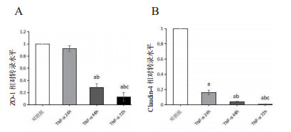 与对照组比较, aP < 0.05;与TNF-α 24 h比较, bP < 0.05;与TNF-α 48 h比较,cP < 0.05 图 5 大鼠AEC-Ⅱ的ZO-1(A)、Claudin-4(B)mRNA水平的变化 Fig 5 The changes of ZO-1 (A) and Claudin-4 (B) mRNA levels in rat AEC-Ⅱcells |