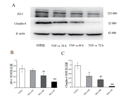 (A)ZO-1、Claudin-4、β-actin蛋白条带; ZO-1(B)、Claudin-4(C)表达的变化; 与对照组比较, aP < 0.05;与TNF-α 24 h比较, bP < 0.05;与TNF-α 48 h比较,cP < 0.05 图 6 大鼠AEC-Ⅱ紧密连接蛋白ZO-1、Claudin-4蛋白表达的变化 Fig 6 The changes of ZO-1 and Claudin-4 proteins expression in rat AEC-Ⅱcells |