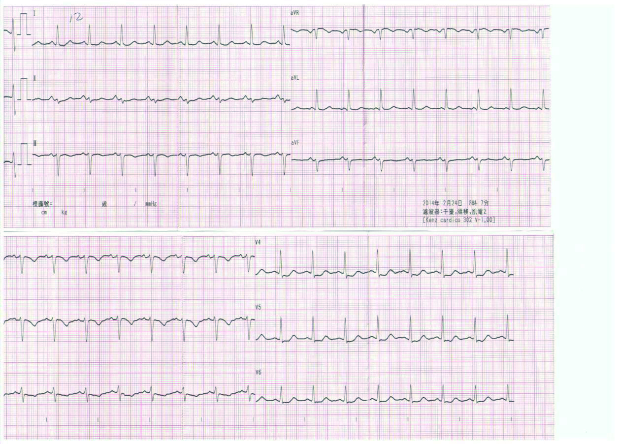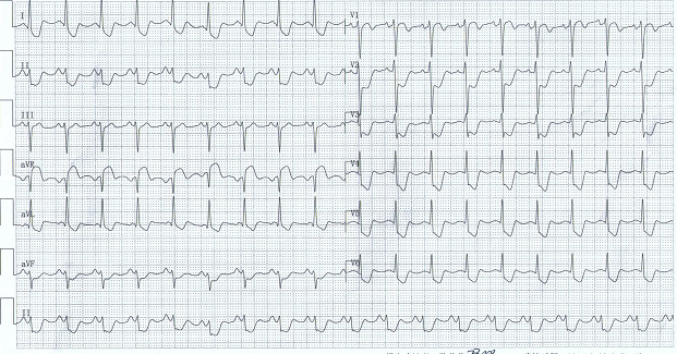 图 1 患者胸痛发作时心电图(示Ⅰ、avL、Ⅱ、Ⅲ、aVF导联和V4~V6导联广泛ST段压低超过1.0 mV,且aVR导联ST段抬高,幅度大于V1导联) |