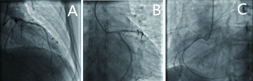 图 3 患者冠脉造影结果(示左主干未见狭窄,A为前降支、B为回旋支、C为右冠冠脉光滑,远端血流TIMI3级) |
