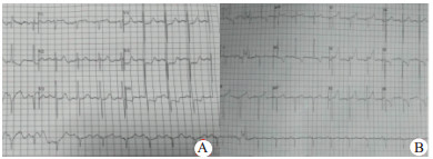 图 1 A:患者入院时的心电图; B:患者入院2 h后的心电图 |