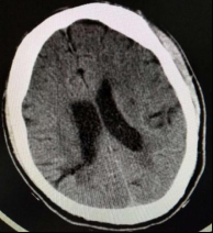 图 2 患者头颅CT图像(右侧颞枕叶条片灶) |