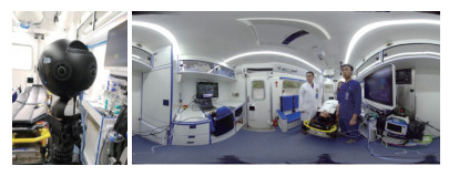 图 4 车载VR摄像头(具备6个广角摄像头)及VR眼镜所见图像 Fig 4 The displayed images from car VR camera (with 6 wide-angle cameras) and VR glasses |