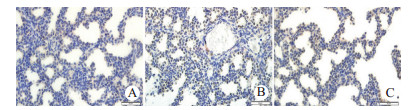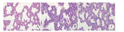 A,B和C分别为SO、APILP和SB组胎鼠肺脏组织(H & E染色,×400) 图 1 各组胎鼠肺脏的病理改变 Fig 1 Morphological changes of fetal lungs in each group |