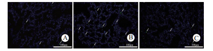 注:A,B和C分别为SO、APILP和SB组妊娠大鼠的胰腺组织; 胞浆内可见明显绿色荧光的细胞为MPO阳性表达)(免疫荧光染色×200) 图 3 各组胎鼠肺脏中MPO的表达情况 Fig 3 MPO expression in fetal lungs in each group |