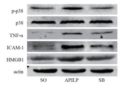 与SO组比较,APILP组胎肺中p-p38MAPK(q=29.74,P < 0.05)、TNF-α(q=37.42,P < 0.05)、ICAM-1(q=21.98,P < 0.05)、HMGB1(q=17.28,P < 0.05)的表达水平显著增加; SB20358干预后,胎肺中p-p38MAPK(q=27.59,P < 0.05)、TNF-α(q=20.58,P < 0.05)、ICAM-1(q=13.85,P < 0.05)和HMGB1(q=7.36,P < 0.05)的表达水平较APILP组显著减少,但除p-p38MAPK外仍高于SO组(q=2.15,P > 0.05;q=16.85,P < 0.05;q=8.13,P < 0.05;q=9.93,P < 0.05),见图 4、表 2。
