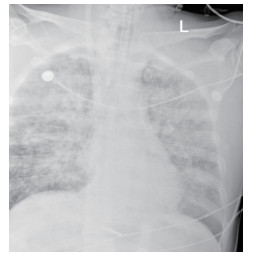 该患者入院后因氧合不能维持、呼吸窘迫直接从急诊收治ICU,大剂量激素冲击及气管插管,呼吸机SIMV+PS模式支持治疗,氧合指数改善不明显,及时行俯卧位通气,但氧合指数仍然小于100,PAO2 38 mmHg, SpO2 78%左右,考虑患者病情危重,且血流动力学不稳,血管活性药剂量大,当天下午行V-V模式ECMO治疗(右侧颈静脉-右侧股静脉),血流速度3.5 L/min,氧流量3.5 L/min,氧体积分数50%,行保护性机械通气,通气模式是压力控制(PC 15 cmH2O,PEEP 8 cmH2O,FiO2 50%,f 12次/min), 镇痛镇静,RASS评分在-4~-5分,必要时阿曲库铵静脉推注行肌肉松弛治疗。其他治疗:甲强龙500 mg治疗3 d,然后逐渐减量;乙酰半胱氨酸抗氧化、化痰、CRRT等支持治疗。ECMO治疗后生命体征明显改善,治疗第2天,血管活性药逐渐减量。治疗3 d后,循环稳定,停用血管活性药,床旁胸片提示:两肺弥漫渗出性改变,较前明显好转。患者症状好转,调节ECMO参数:血流速3 L/min,气体流速3 L/min,氧体积分数35%,控制SpO2 95%~100%之间。在ECMO治疗期间根据血流动力学和血气分析结果不断调整ECMO参数,在ECMO治疗5 d后,脱离ECMO,通气模式改为SIMV+PSV并过渡到PSV(PS 16 cmH2O,PEEP 5 cmH2O,FiO2 30%),氧合良好,在脱离ECMO 2 d后停呼吸机,停机1 d后拔除气管插管。行胸部CT检查示:两肺散在炎性病变,双侧胸膜腔积液(图 3),床旁胸片提示两肺炎性病变(图 4),两肺弥漫性渗出明显改善。后经1周治疗,查胸部CT示:右肺中下叶及左肺少许慢性炎性改变(图 5),病情稳定转至呼吸科病房。