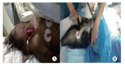 A:实验猪制作CA模型前准备;B:实验猪电除颤 图 1 实验动物模型制备和电除颤 Fig 1 Preparation of experimental pigs and electric defibrillation |
