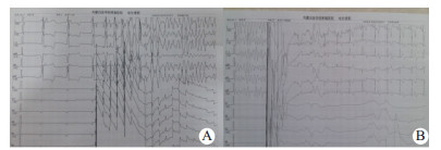 图 2 室颤心电图(A)和除颤后心电图(B) Fig 2 Ventricular electrocardiogram and electrocardiogram after ventricular fibrillation |