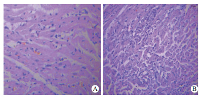 A: UTI组心肌组织病理学改变;B:对照组心肌组织病理学改变 图 3 UTI组和对照组心肌组织病理学改变(HE×200) Fig 3 Myocardiac histopathological changes in the UTI and control groups (HE×200) |
