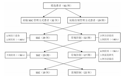 本研究治疗及检测均获得患者或家属的知情同意。采取前瞻性交叉对照的类试验研究的方法,入选患者每24 h两组互换交叉,即每个患者应用SGC或常规血糖管理均进行24 h后交替,试验终点为96 h。入选标准:发生应激性高血糖且至少有一次血糖≥10.0 mmol/L并需进行静脉输注胰岛素进行治疗者,年龄≥18岁,预计入住ICU时间≥96 h的患者。排除标准:酮症酸中毒; 非酮症高渗性昏迷; 孕妇; 胰岛素过敏者; 濒死或24 h内可能死亡的患者,入选流程见图 1