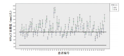 本研究中,SGC管理方式血糖监测平均间隔时间短于常规管理方式,累积胰岛素用量SGC远高于常规管理方式,且差异有统计学意义(P < 0.05),表明应用SGC进行血糖管理会增加护理人员的工作量,但是会更加精确地做到随时监测患者由于营养或其他治疗所致的血糖变化,以维持血糖的平稳,避免血糖忽高忽低影响患者病情。此结果与国内外进行的SGC或eMPC进行的临床研究结果一致[3-6, 11]